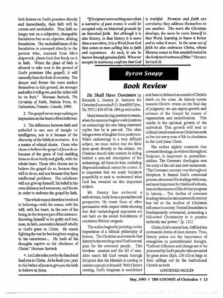 He shall have dominion by kenneth l. Gentry, jr., march 2006, wipf & stock publishers edition, paperback in english. Most protestants today believe that jesus cannot rule successfully through his people in every area of life until he returns to earth bodily and sits on a political throne in jerusalem.