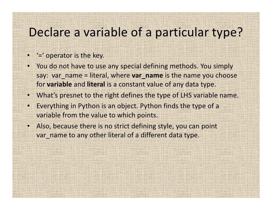 Second, undefined can be used to declare the type of a variable without using a comment In this tutorial, you'll learn to declare a string variable in python in 4 different ways. Learn about python variable declaration, print variables, types, python variable scope, delete def: